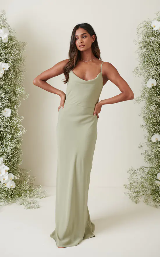A bestseller, this dress features a bias cut that flatters all body types. Available in several colors, it’s a must-have for weddings or evening parties.